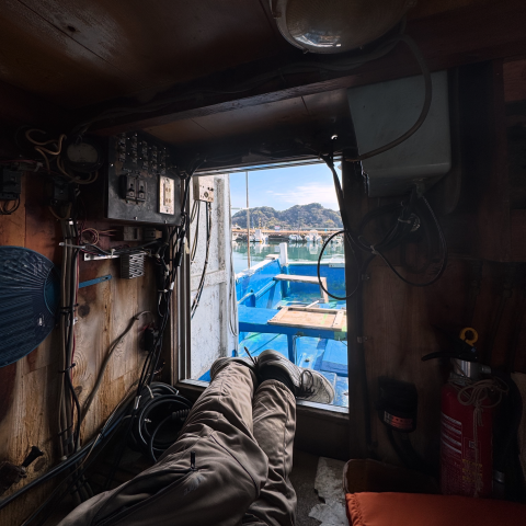 そして、船ともまだ仲良くなってなかった。他人の船に乗っているような感覚で操舵していたから、少しでも親しくなれるよう、小さな船室に寝そべってタンタンタンと鳴るエンジン音を聞いていました。