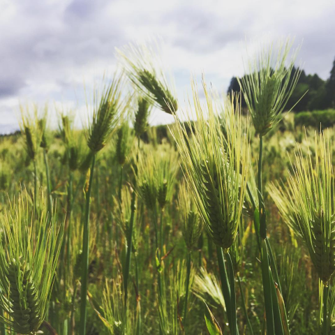 シャープネスにもほどがある。夕陽に沈んでいく麦畑、奥には米良大根の白い花畑。 #畑の風景 #麦