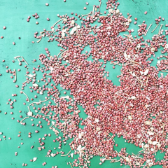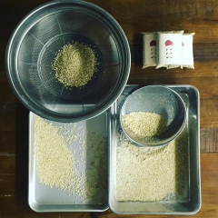 次に写真右上のふるいにかけて小さな粒や草の種などを取り除きます。それを左のバットに広げ異物がないか目で確認。左上が全てチェックが終わった麦。全て手作業で行っています。