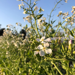 明日のみそみそ便のオマケはスナップえんどう…と、思っていたのですが、今ひとつ数が取れないのでこちらにしました。 「鞘大根」という名前で販売してる地域もあるようです。満開の花の中でできたばかりの大根の実。
