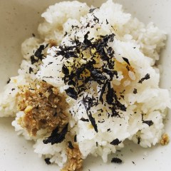 みりん入りで炊いた白米にオリーブオイルをかけて、麦味噌と京都のプレインピープルさん  @plain_people_kyotoでいただいた海苔をパラパラとかけて混ぜ混ぜするだけ。これがおじやみたいで美味しくて!