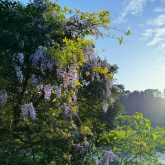 時速60km以上でみながビュンビュン通り過ぎる川沿いの道で、西陽に揺れる藤の花が目にとまりました。