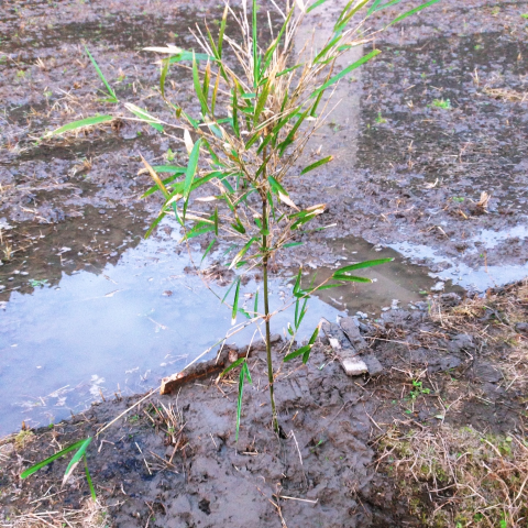 次の日に田んぼに行くと、私が疲れ切って出来なかった部分の畦塗りが終わらせてあり、写真のように笹が立ててありました。当時の僕はめちゃくちゃかっこいい!と感激したものです。