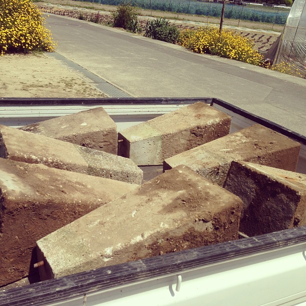 クソ重た…ハウスをバラして80キロぐらいの根石14個、2回に分けて運びます。