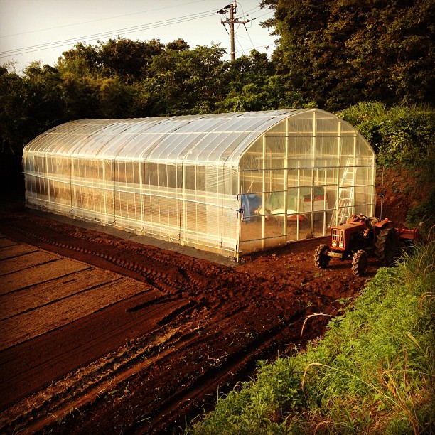 防虫ネット張って防草シートひいて改めてハウス完成の図。まだまだ手を加える事になりそう。