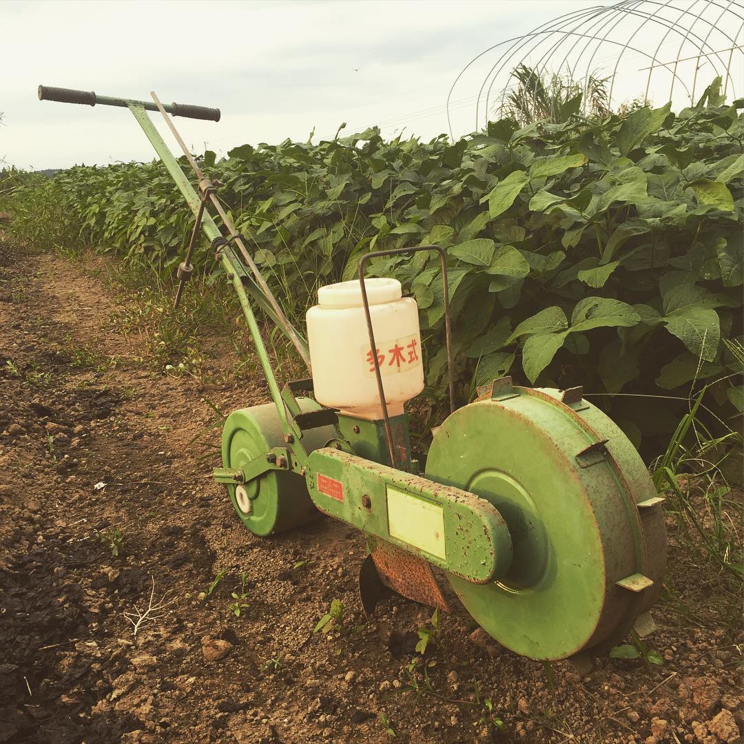 夕陽が播種機を朱色に染めて、昭和の播種機は宝物のように見えました。