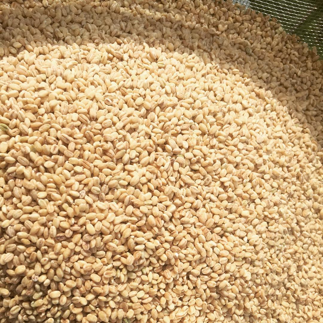 久しぶりの太陽!ようやく麦の選別ができますよ。風で細かいゴミを飛ばしたらバットに少しずつ広げて異物を取り除きます。
