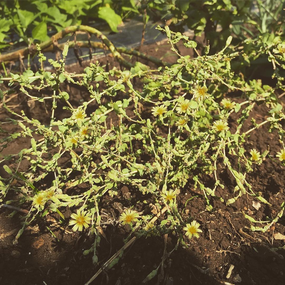 倒れてもなお咲いているサニーレタスの花。今日は日差しが強いけど風が涼しくて高原にいるみたいだ。
