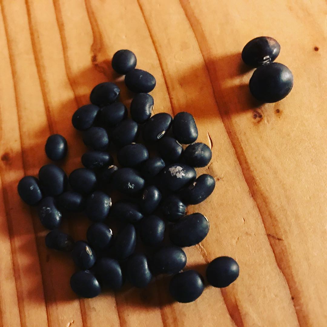 左端昨年地主さんの庭先に一株だけ生えているのを見つけ、ひと枝だけ分けてもらった小さな黒大豆。右は加工場向かいのおばちゃんに分けていただいた黒大豆。 #在来種 #極小黒大豆
