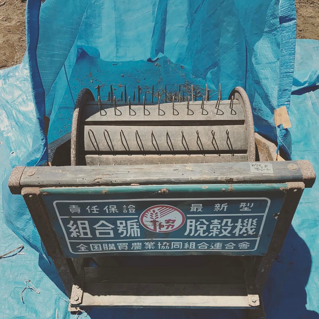 今日はこれで小麦を脱穀します。足踏み式脱穀機