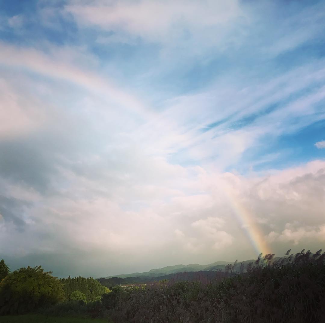 虹!遠くで川の音が聞こえる静かな畑の朝。心地よい風が吹いています。