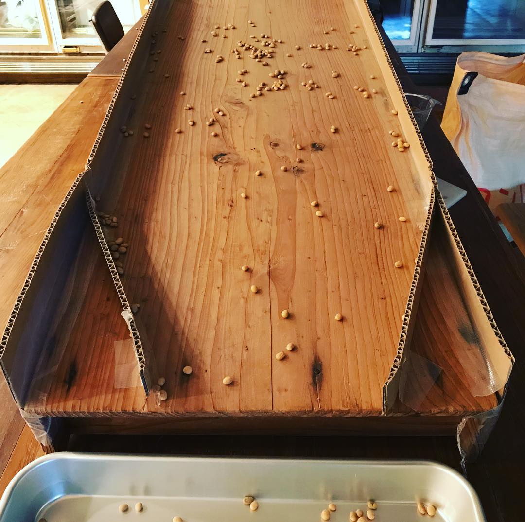 自作大豆選別機…と言えるほどのものではないですが、これで多少は効率良くなりました。種まきに備えていい大豆を選別してます。
