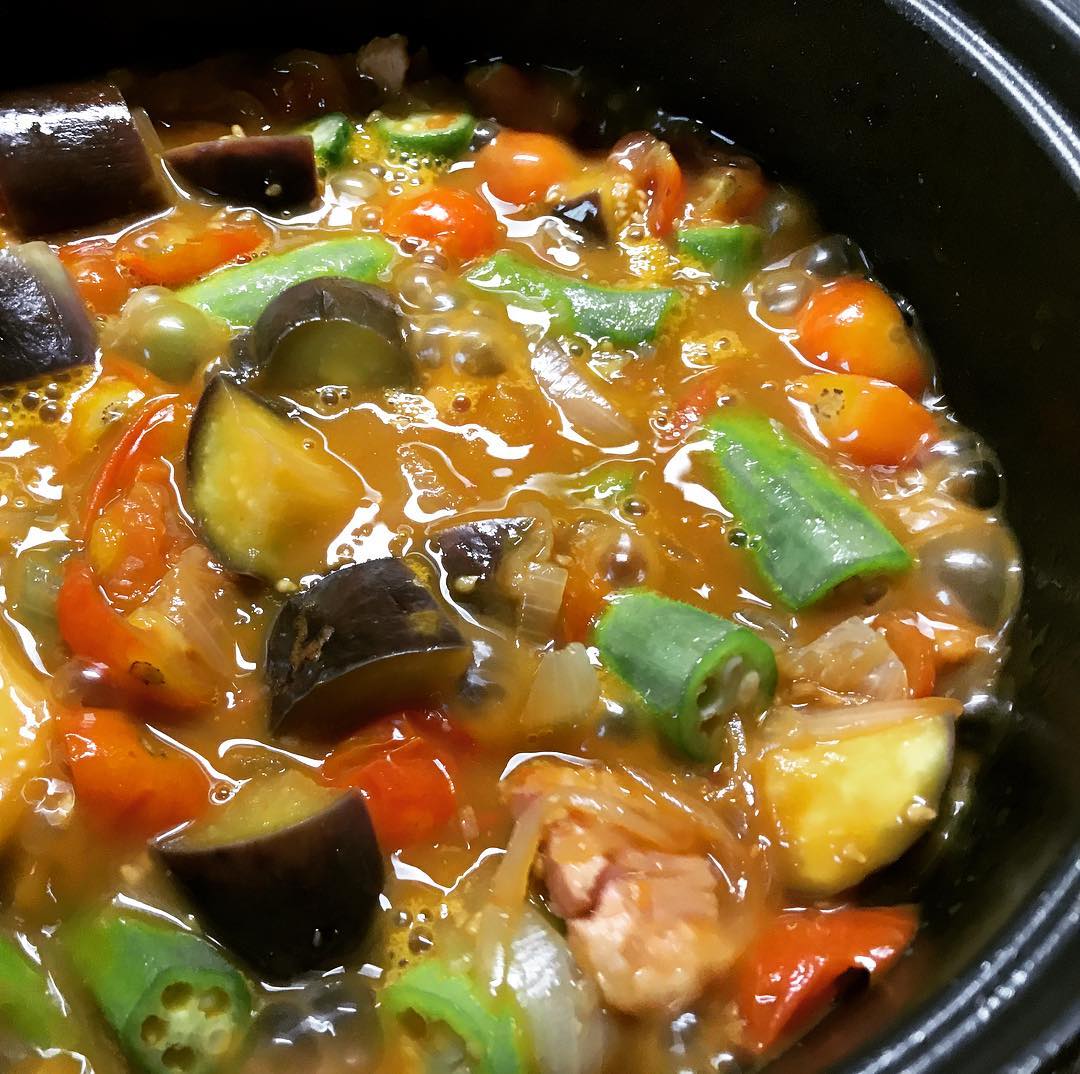 玉ねぎ、トマト、オクラ、ナス、全て自家製の野菜トマトソース仕込み終わり〜