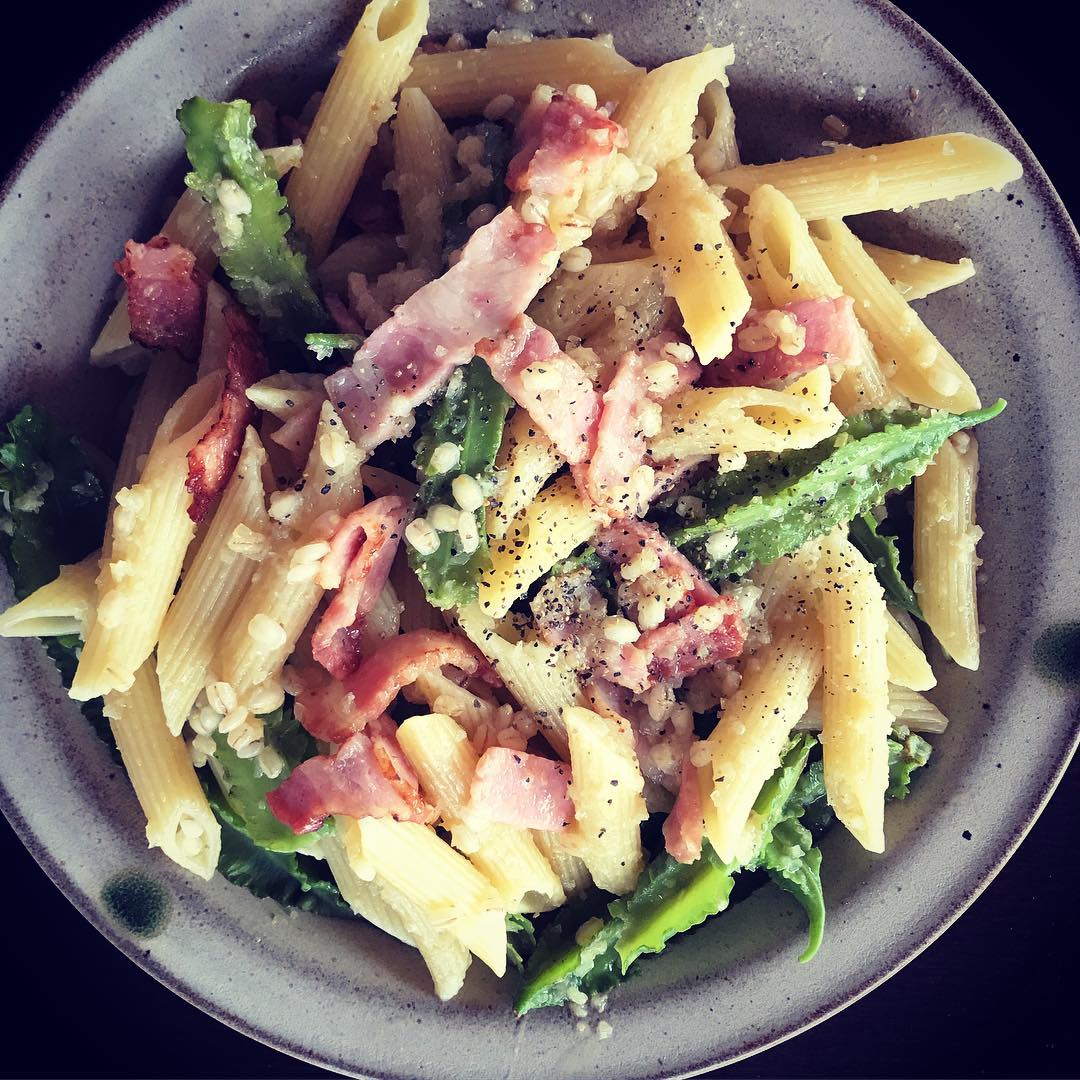 昨日のマカロニの影響でペンネが無償に食べたくなり。ながとも農家さんのディップでいただきます #シカクマメ #ごはん麦