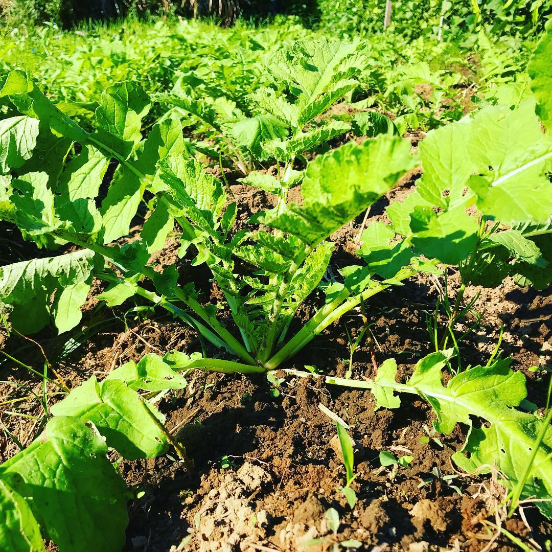 米良大根さん。長雨の間に随分と大きくなりました。今年はどれだけ葉っぱが食べられるかな?