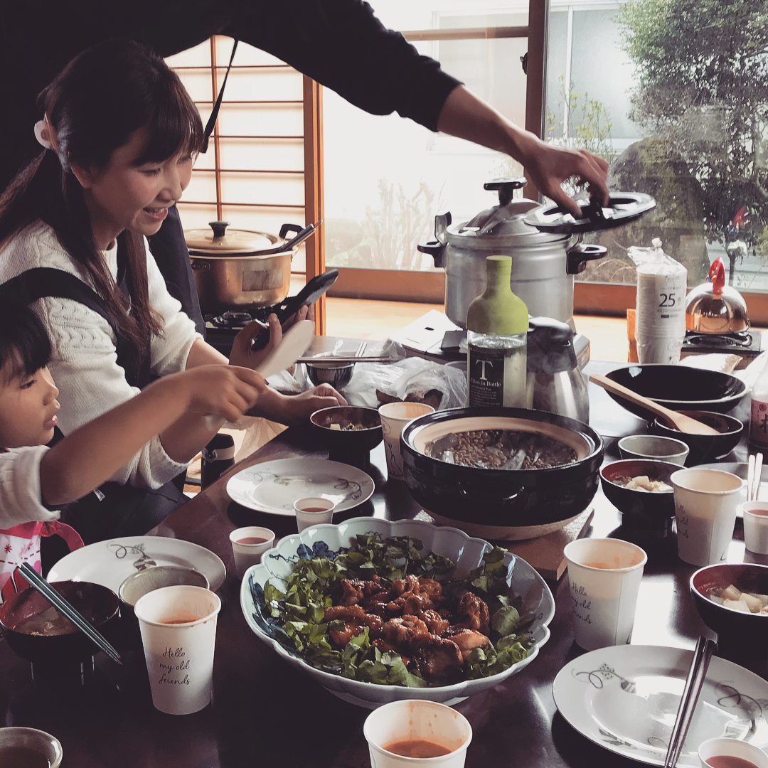 カマドで炊いた麻尻大豆は陽の光を浴びてキラキラ光っていました。ごはん豆をみんなで食べた、持ち寄りお昼ごはん。お味噌汁はうちのキャベツと米良大根、米も我が家の自家製。一生懸命育てたものを、大切にごはんにしてくださり、おいしいおいしいと目の前で食べてくださる…なんて至福の時間でしょう。最後はみんなでお味噌を仕込みました。うららかな春の日。素敵な時間をありがとうございました。 #味噌造り #ワークショップ