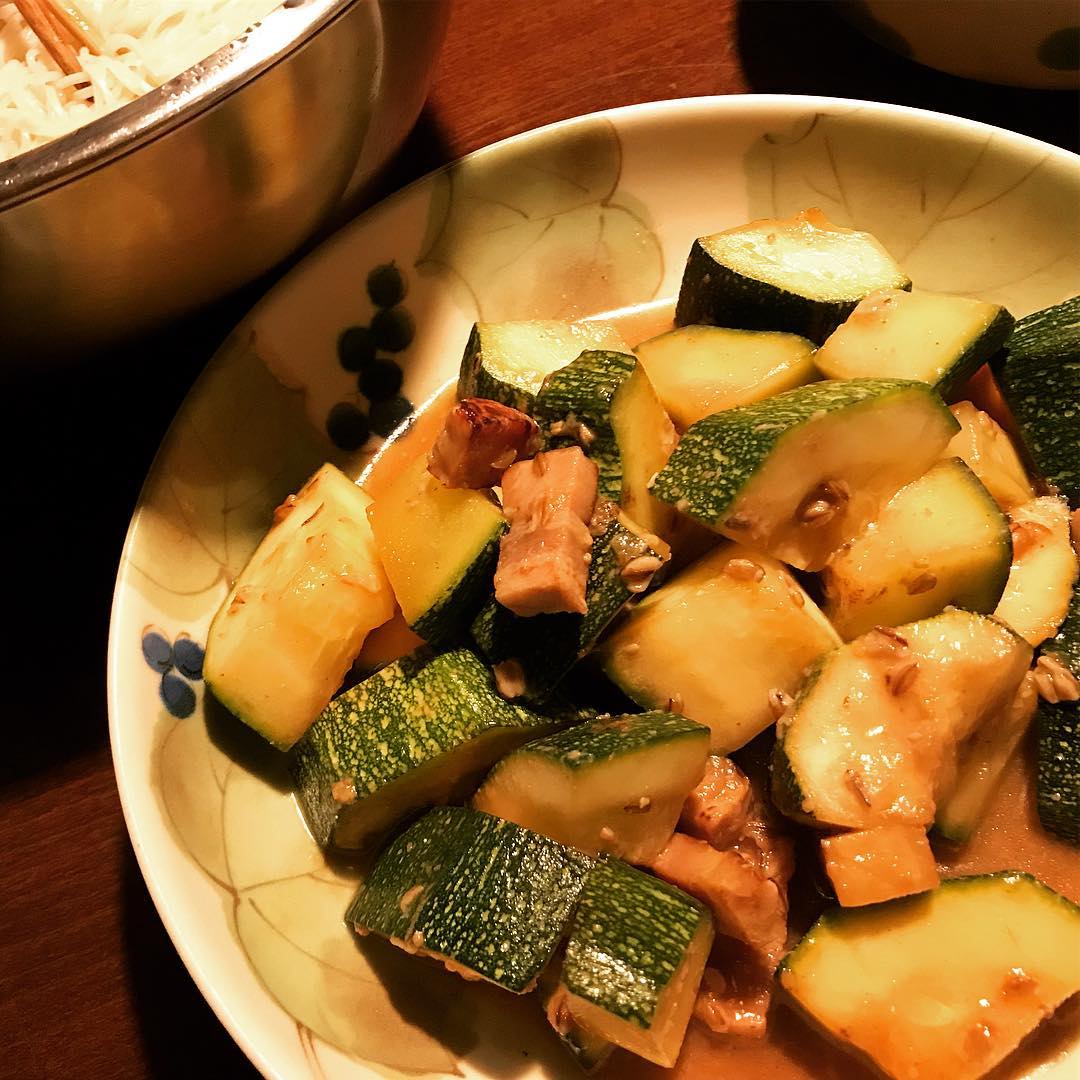 今日はナス的扱いで味噌煮浸しです。子供達からの「ズッキーニ飽きた」というクレームは、冷やしそうめんでごまかした(つもり)。そろそろカレー行くか… #お父さんごはん #自家製ズッキーニ祭り