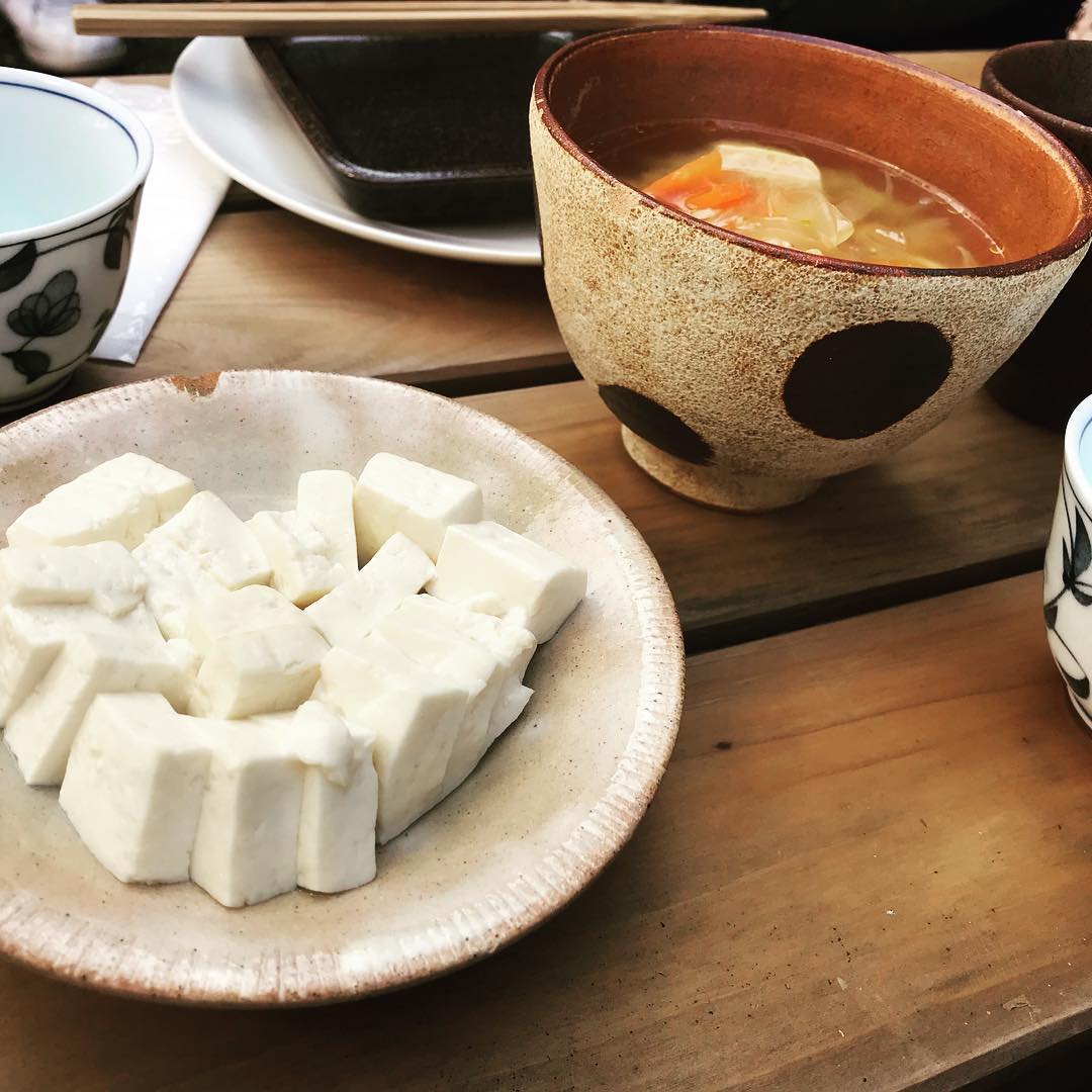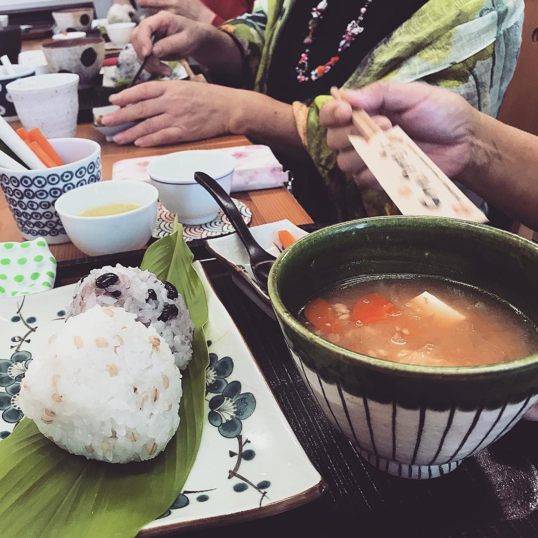 むかし麦茶のウエルカムドリンクにはじまり、ごはん麦・きょうははんなりお豆はんのおにぎり、出汁なしの野菜の味噌汁、そしてきわめつけはお菓子の小山田さんによる味噌餡のおまんじゅうと日向時間さんのお茶。