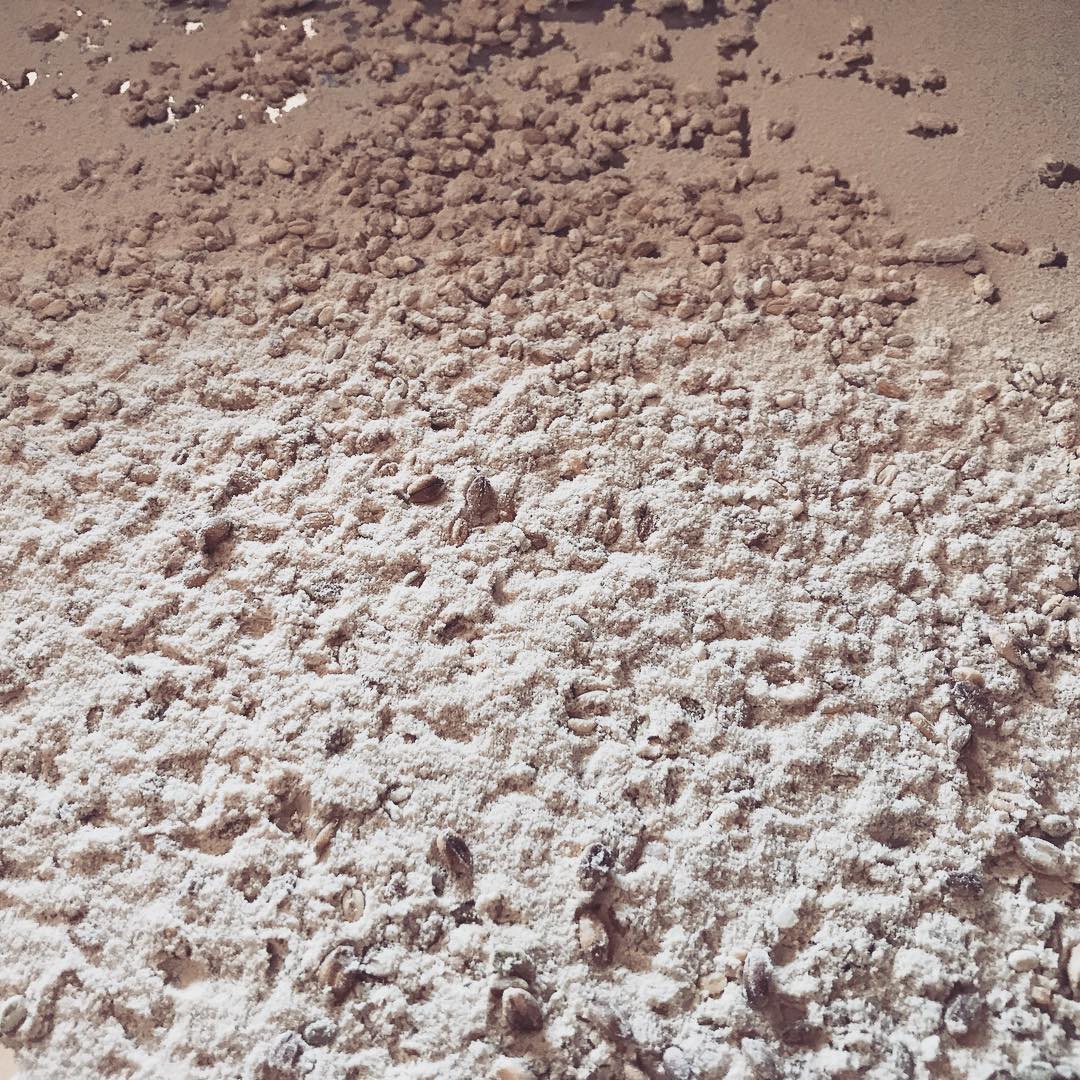 ふるいで精麦された麦をふるったあとは雪景色のよう。