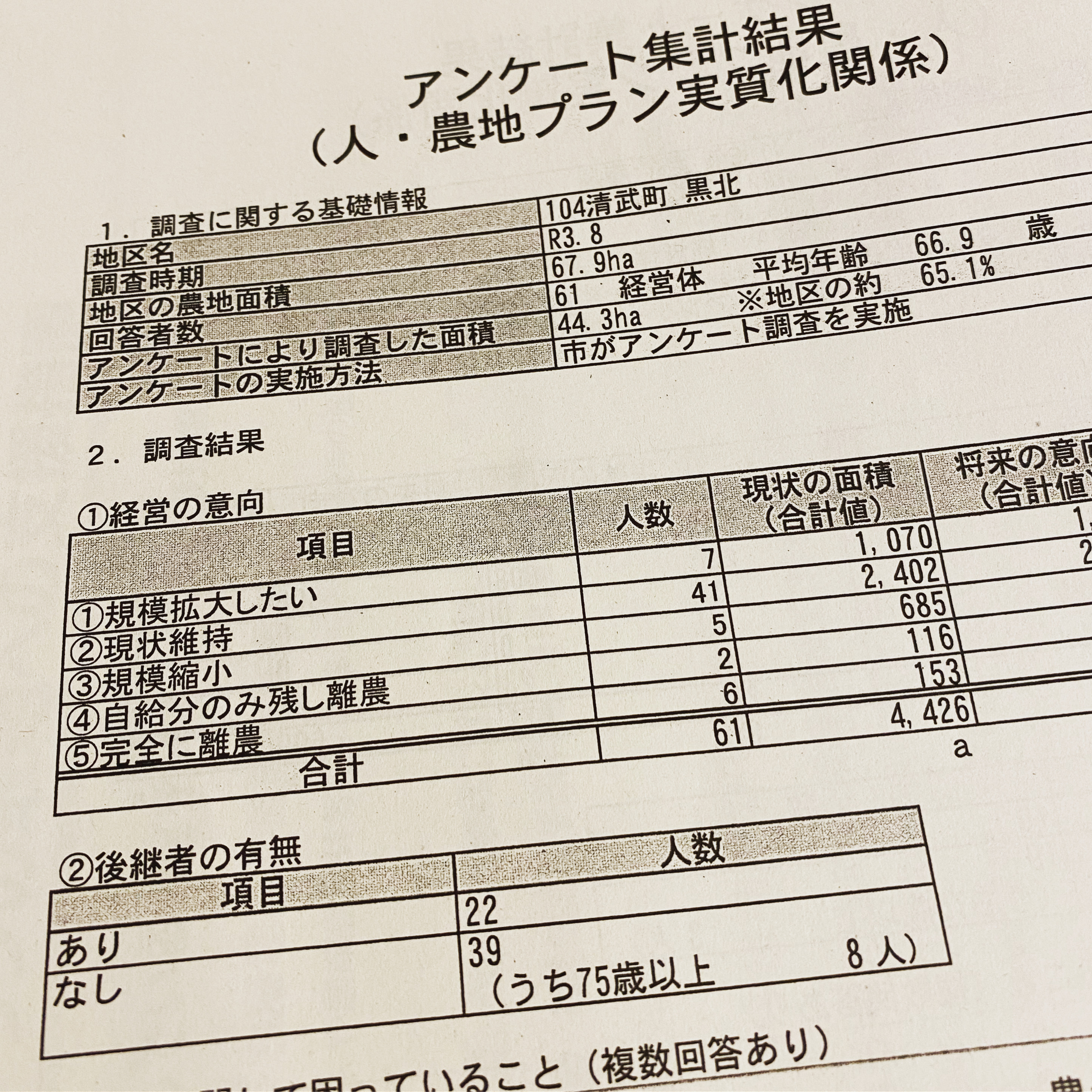 平均年齢66.9歳、後継者なし39件、うち75歳以上の高齢者8件。