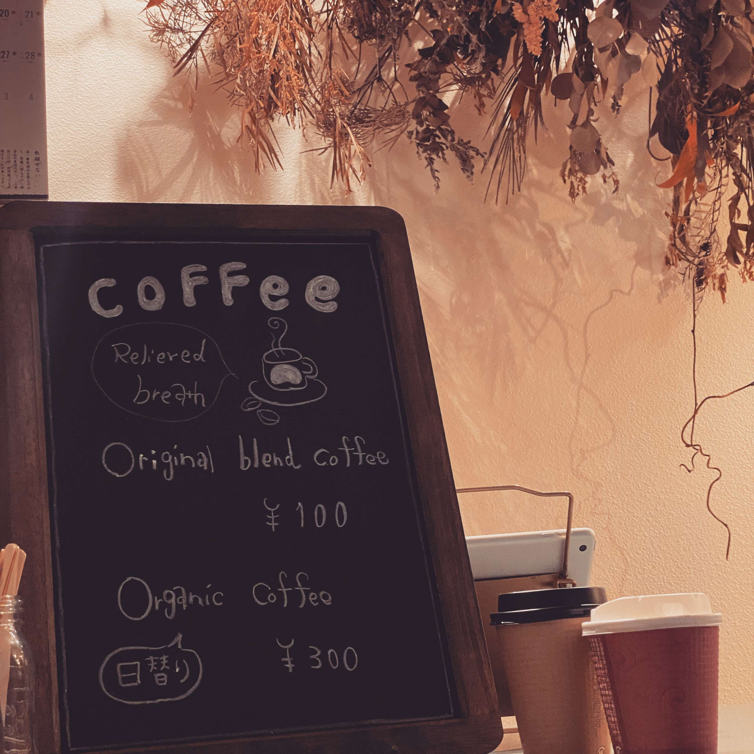 普通のレギュラーコーヒーが100円、オーガニックコーヒーが300円。京都の玉屋珈琲店さんのオーガニックブレンドをお出ししています。