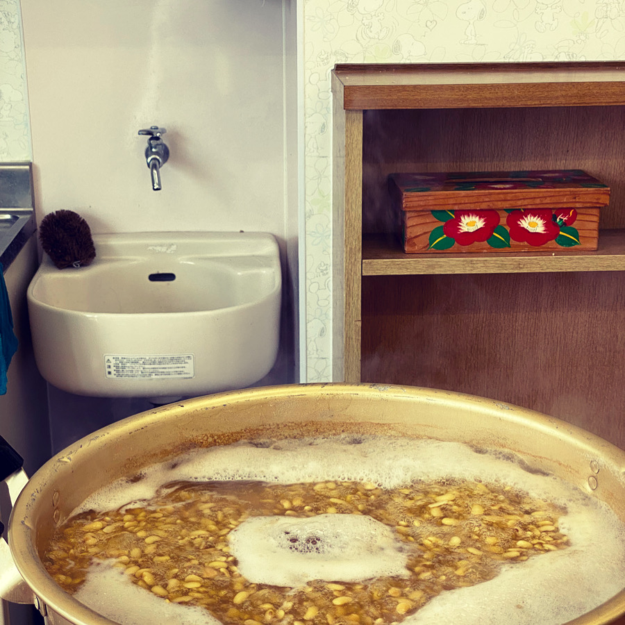 本日は福岡の堅粕保育園さんでみそづくり。ゆっくり大豆をコトコト煮ています。