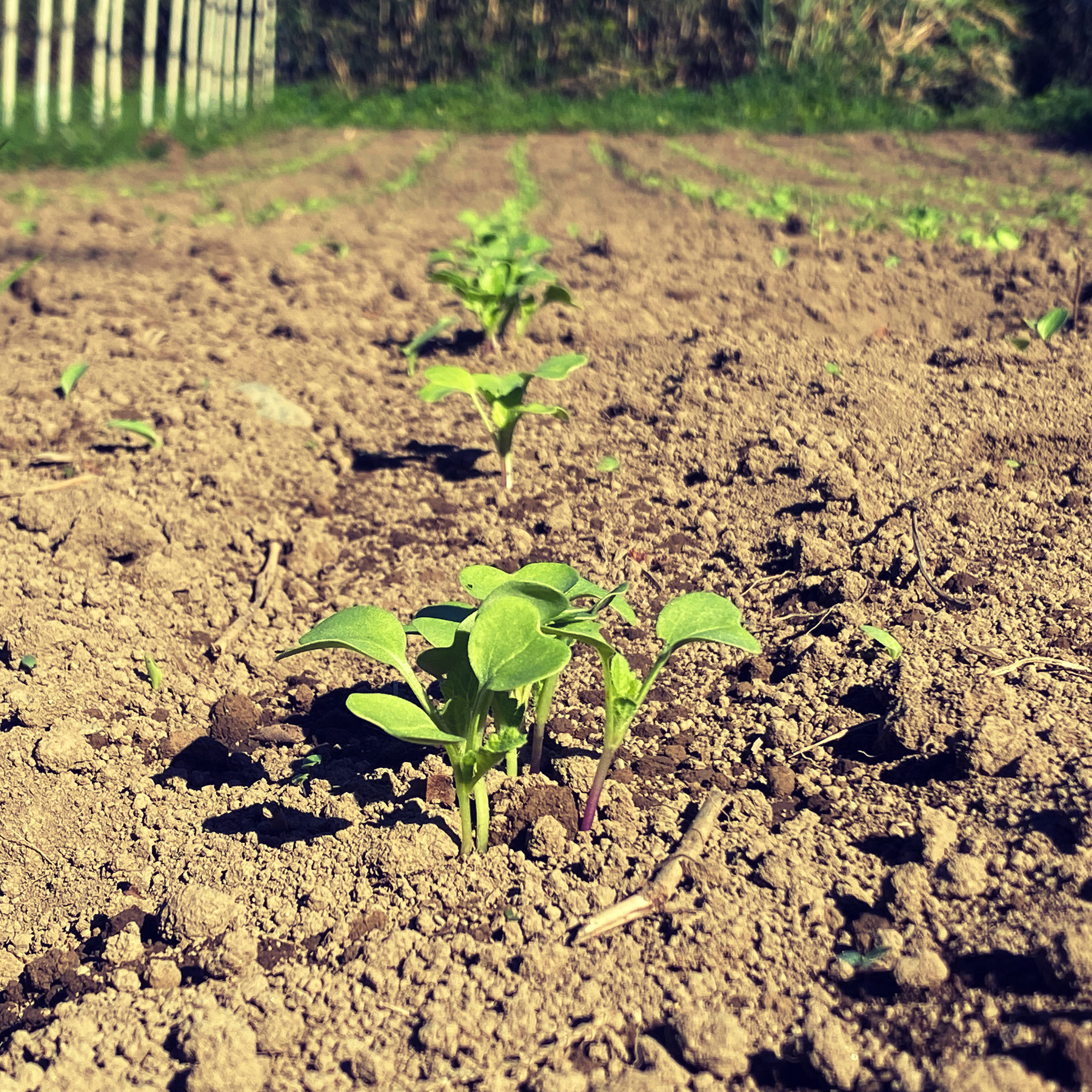 出る前に蒔いた大根が、しっかりおりこうさんで迎えてくれました。