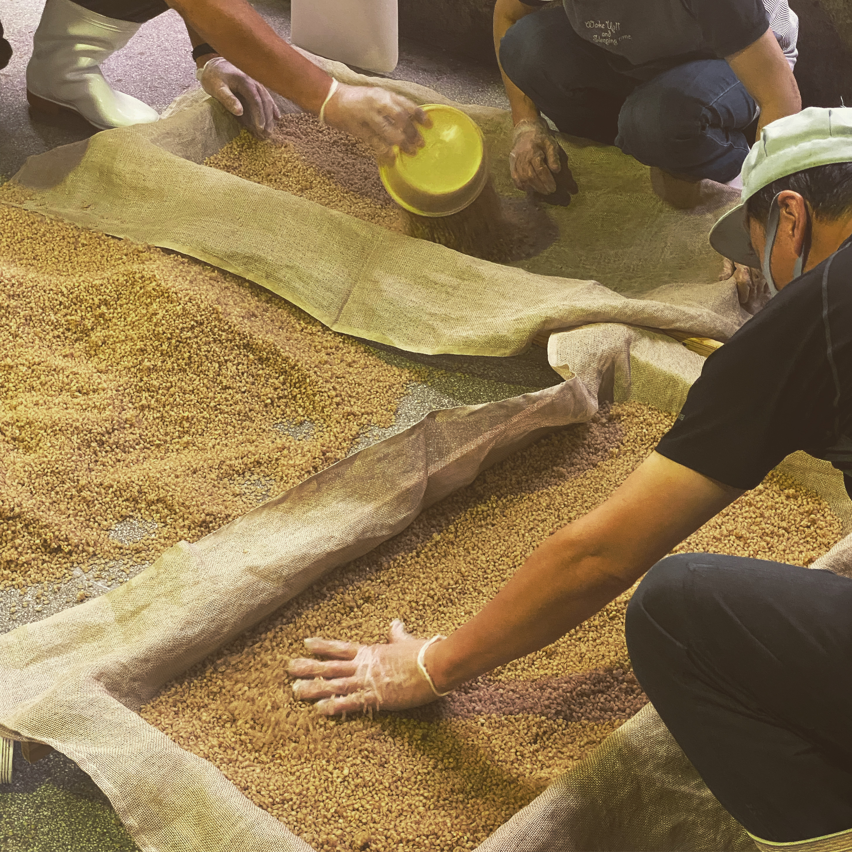 蒸した麦に麹カビの菌を混ぜて手際よく混ぜ合わせ、室に入れて二日間かけて麹ができあがります。