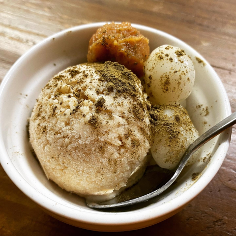 豆乳クリームのコクとたまり餡あずきの甘いハーモニー、そしてふわふわの豆腐白玉と寒天のぷりぷり食感。さらに塩茹で有機あずきと、贅沢にも沖醤油を使った黒蜜が旨みを引き立てます。