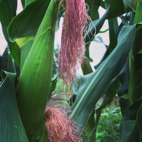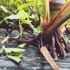 もちきびの根っこ(?)。こうして地上部からも生えてきて、マルチシートを突き破り再び地面に入っていく。大きな体を支えるため?