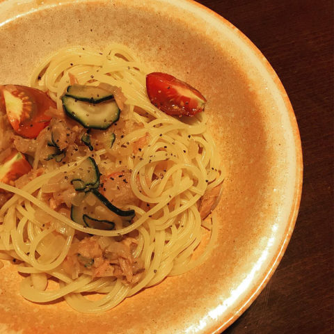 本日は冷製パスタ。炒め玉ねぎとニンニクの風味とブラックペッパーが爽やか!トマトはフードカーニバルでご一緒したごくとまさん! #お父さんごはん #ラディッシュ #自家製ズッキーニ祭り