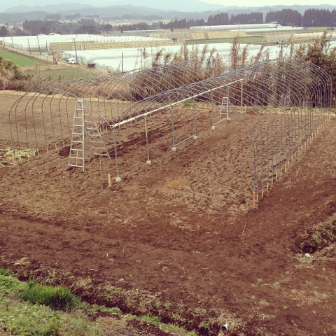 防虫ネット張って防草シートひいて改めてハウス完成の図。まだまだ手を加える事になりそう。 #作業場