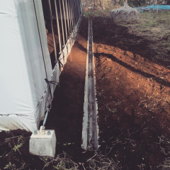 ハウス建て込み 2日目。ユンボもビームの水平器も持ち合わせていないのでスコップと水糸、己の体力のみ。根石が80キロあるので容易に動かせず、調整も大変。これはまだ根石を穴掘って入れただけです。 #作業場