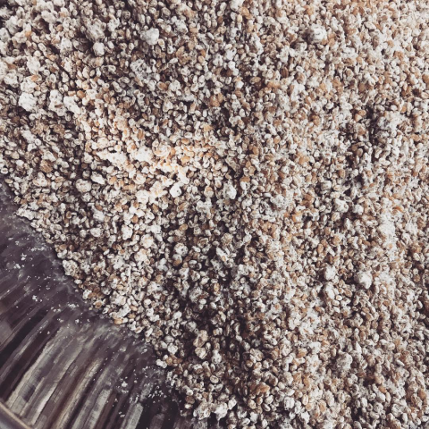 写真は麹に塩を混ぜる塩きりという作業をしたところ。この時点で麹菌は死滅して役割を終えます。麹菌はカビなので、塩の浸透圧で細胞が破壊されてしまうのです。